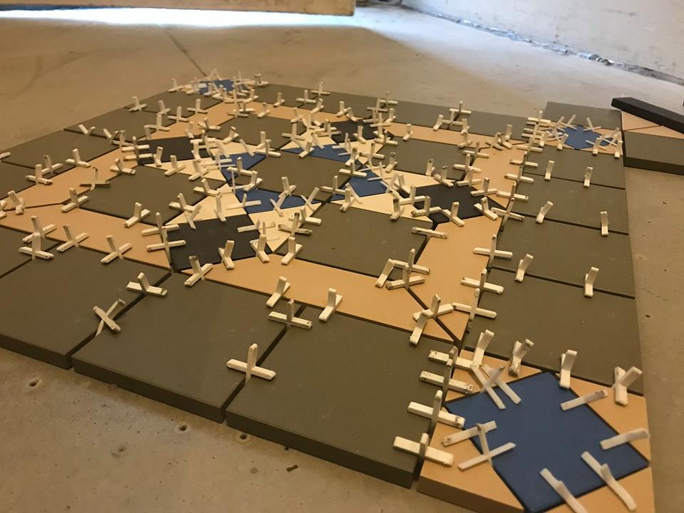 The tiles can vary in size slightly, with these tiles you are inherently tiling different batches of tiles - the factory cannot make Black triangles on the same production line / day as White ones for example. Variation in size can be most noticeable when laying chequerboard patterns. With this in mind, the way to deal with this is to first loose-lay some tiles to decide on the best grout joint width to use and then while fixing be prepared to slightly open and close the joints as you go along. Although on a micro level, the joints are going to vary in widths, when standing looking at the floor they will look fine, this careful joint manipulation will ensure all the lines are lined up and the tiles look neat and tidy. This is the reason we do not recommend that the tiles are supplied to you meshed or sheeted as not only are they are usually badly aligned but you remove the opportunity to adjust the joint widths as just explained.